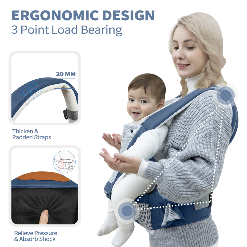 Conception du Siège de Hanche : Conçu avec un large siège rembourré, le bébé est confortablement assis avec les hanches bien soutenues, tout en vous offrant un moyen pratique de monter et descendre facilement et instantanément votre bébé.