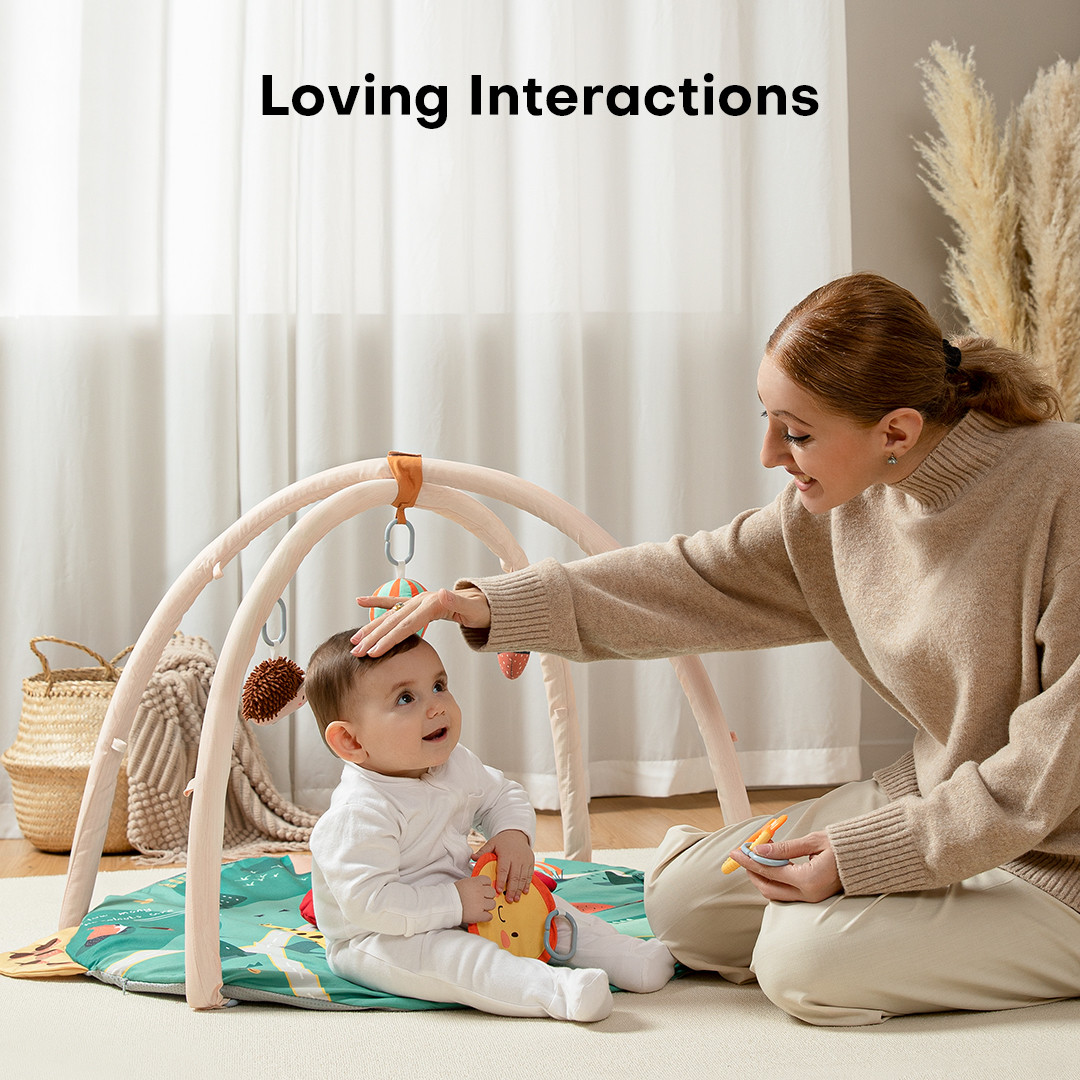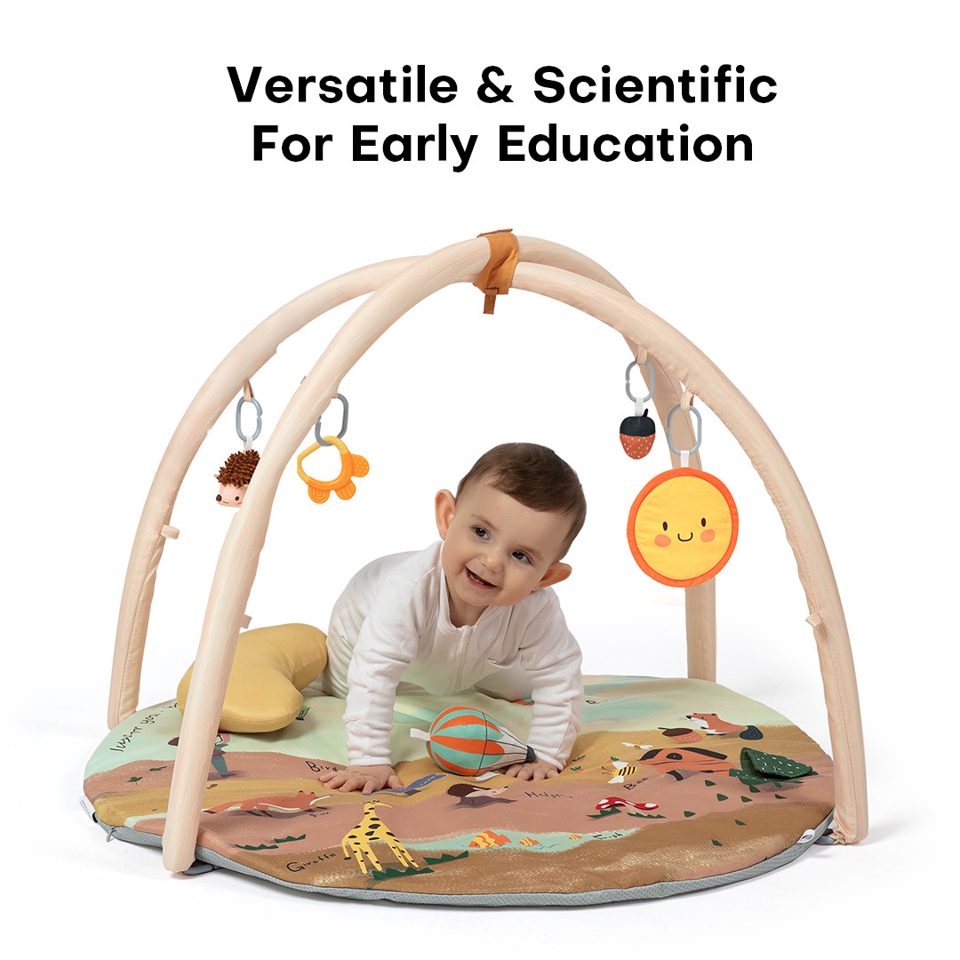 Confortable et favorable : rembourré d'un coussin en coton de 3,1 cm d'épaisseur et recouvert d'un tissu doux en peau de pêche, ce gymnase pour bébé permet de s'allonger, de s'asseoir ou de ramper confortablement. Une base texturée antidérapante empêche le déplacement pendant le jeu, et des supports robustes se forment. arcs stables qui empêchent l'effondrement.