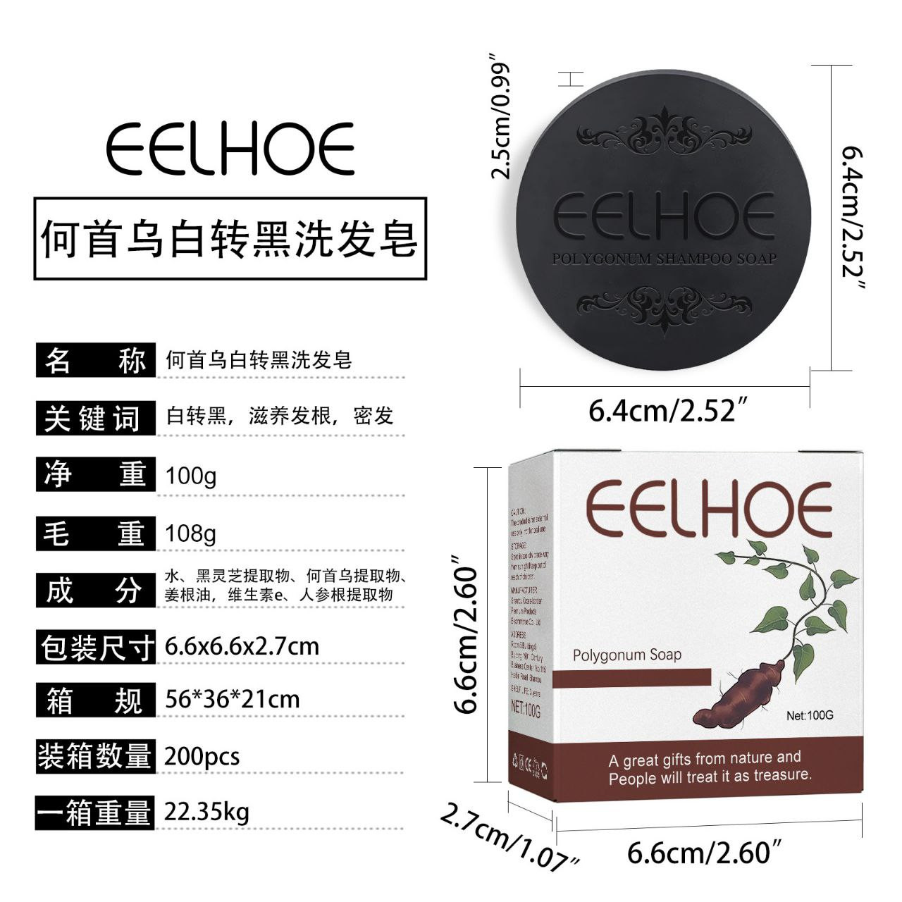 EELHOE Polygonum multiflorum blanc à noir shampooing savon nettoyage en profondeur doux nourrissant cheveux solide