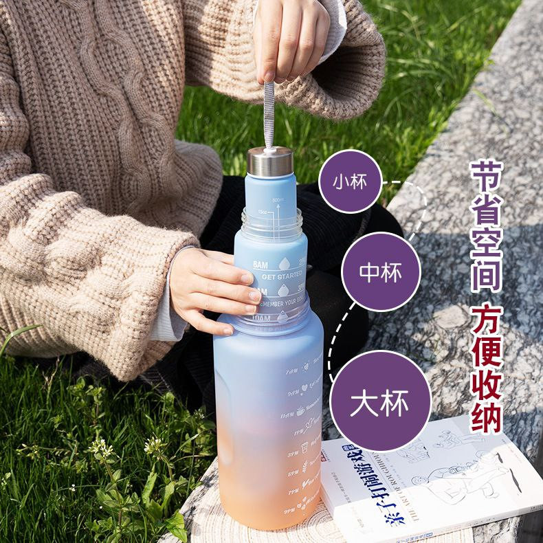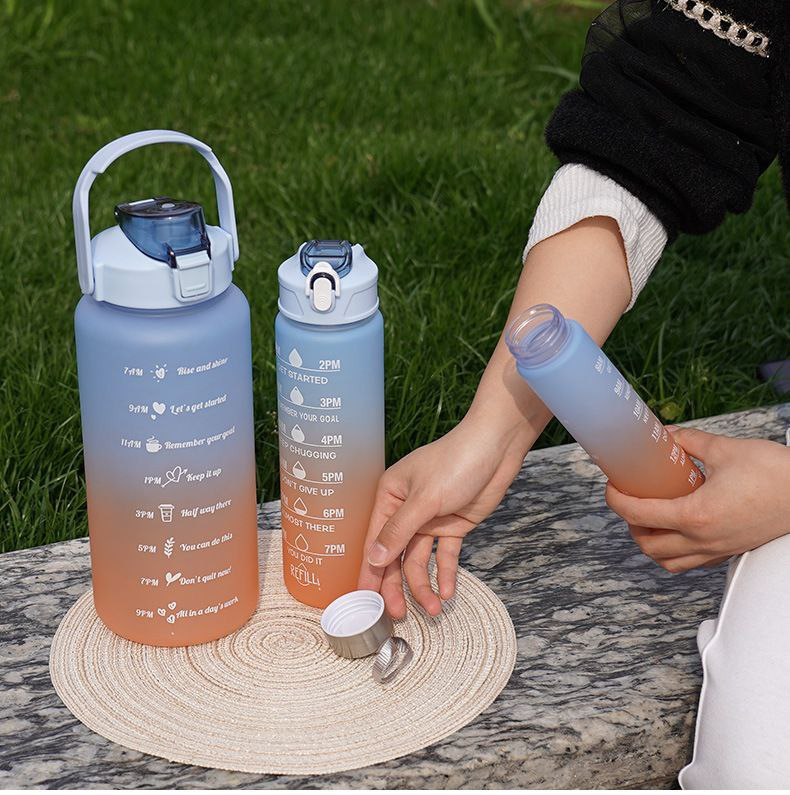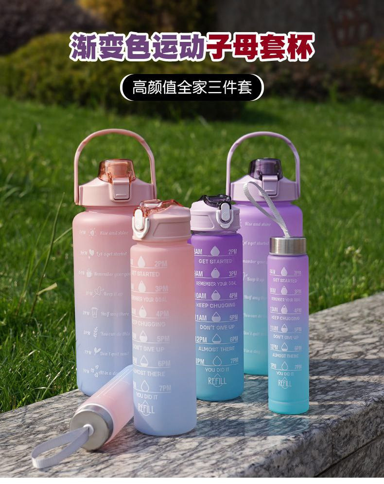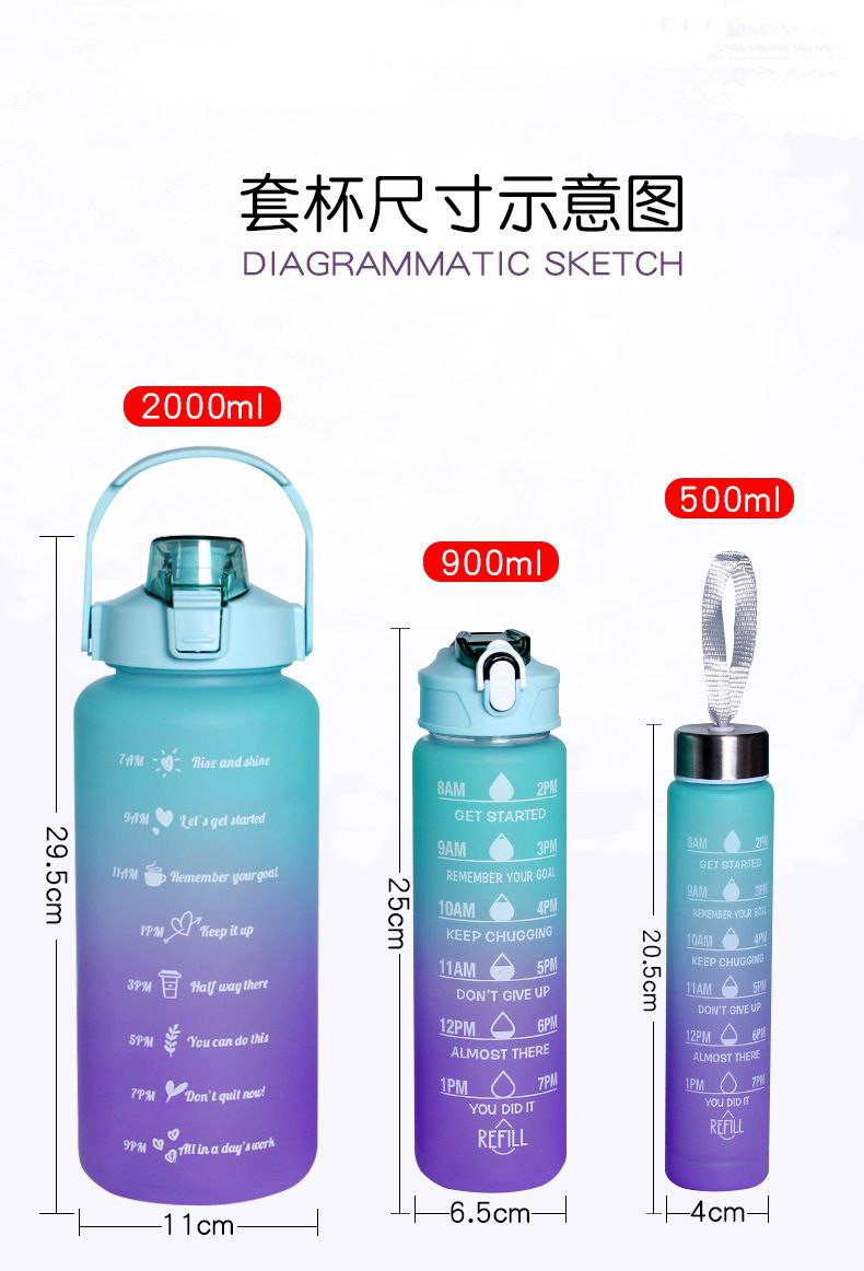 Dégradé trois pièces en plastique bouteille de sport portable paille espace tasse en plein air, tasse bouteille d'eau 2000ml