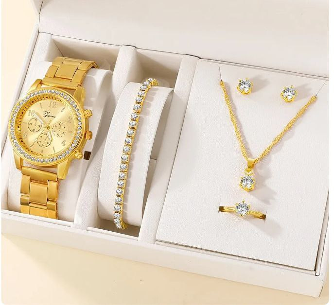 5 pièces/ensemble montre avec bracelet en acier faux trois yeux ensemble de montre à quartz coréenne décontractée pour femme (boîte orange)
