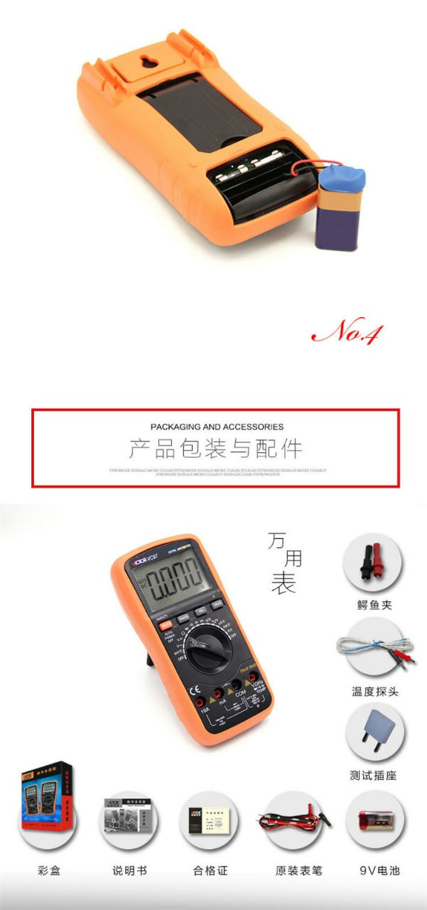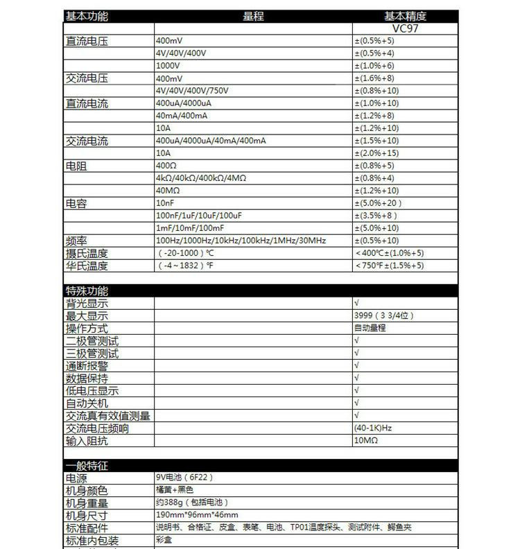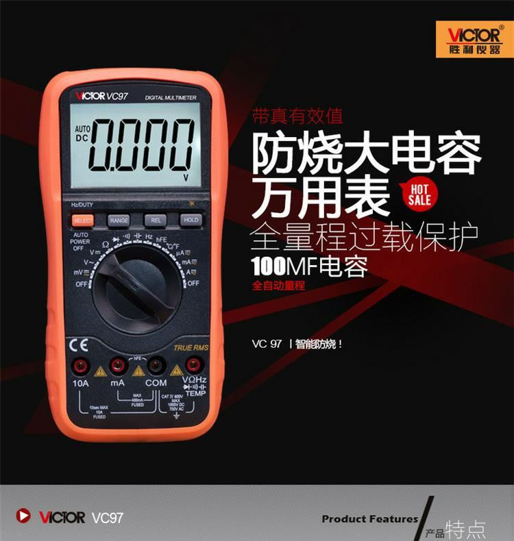Le VICTOR VC97 est un multimètre numérique portable qui peut mesurer le courant continu (DCV), le courant alternatif (ACV), le courant continu (DCA), le courant alternatif (ACA), la résistance, la capacité, la fréquence et la température.