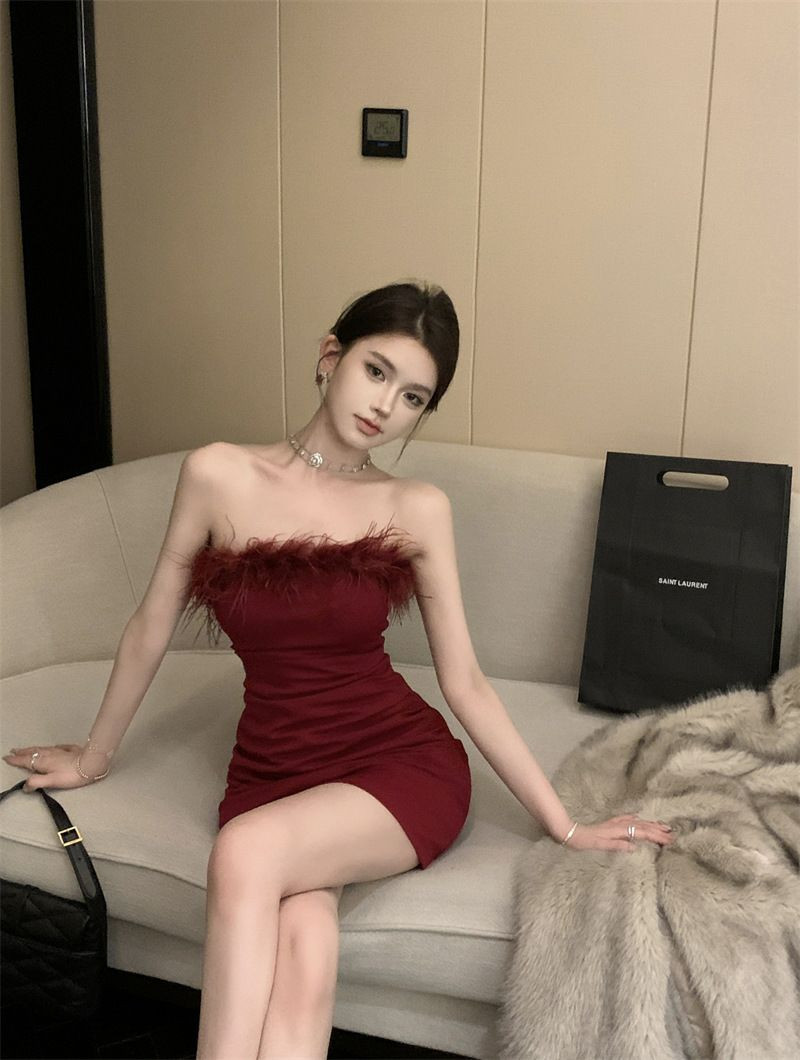Robe courte sans bretelles pour femme - Taille froncée - Dos nu avec un col en fourrure à une seule ligne à la jupe de hanche mince sexy jupe robe pour femme