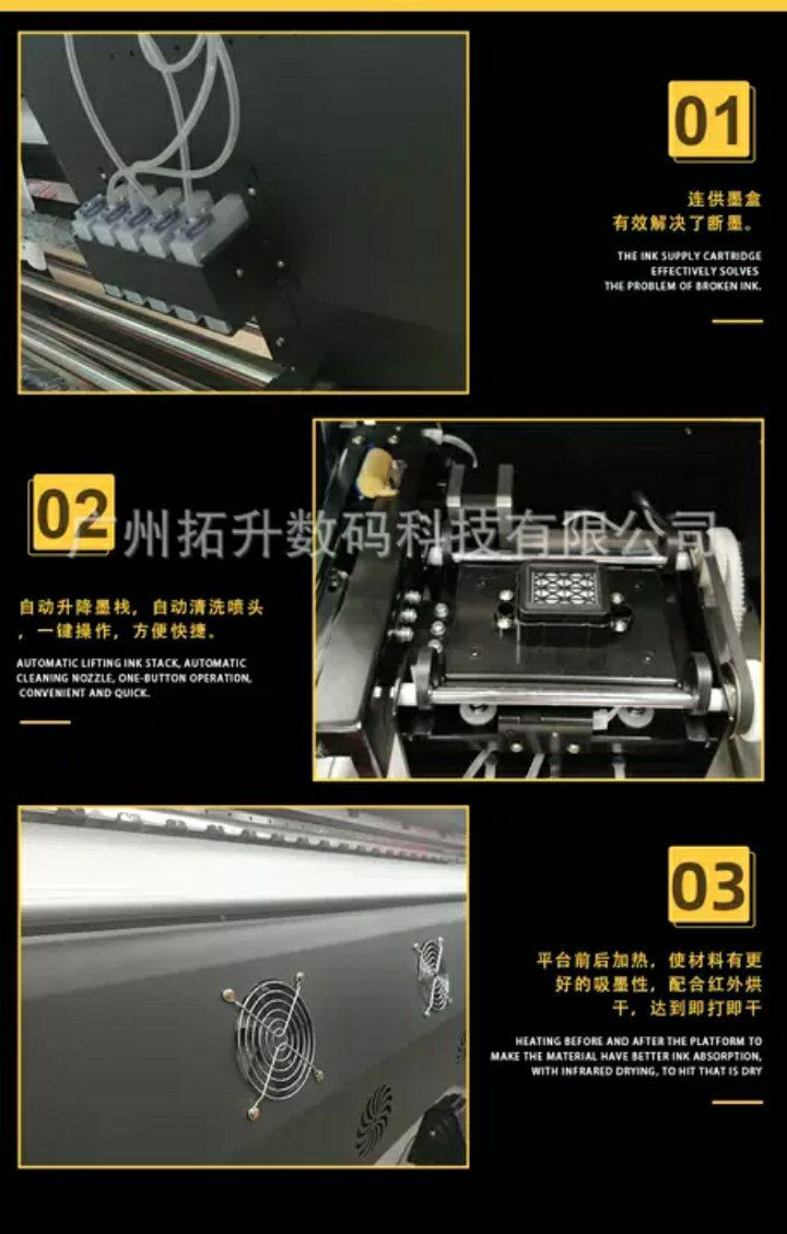 Composants notables : Moteur haute vitesse, plateforme entièrement en aluminium, têtes d'impression Epson, fonction de levage de la pile d'encre, système d'enroulement automatique du papier, et séchage infrarouge.