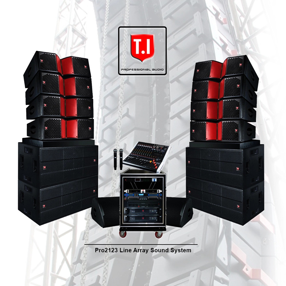 Système complet Pro2123, double enceinte line array de 12 pouces, comprenant Pro2123, Pro218, Pro15M, ampli, processeur, mixeur et micros avec 8 enceintes de graves et 4 enceintes de graves, 2 enceintes de monitoring, ampli, processeur, mixeur et micros sans fil, câbles et prises inclus. Adapté à des concerts de 3 000 personnes, des shows DJ et des événements sonores.