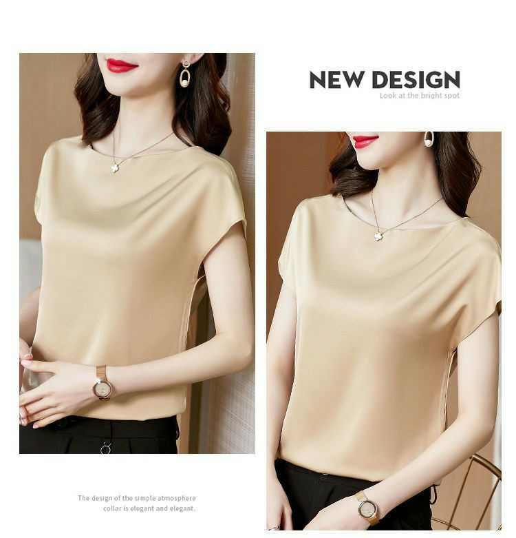 Chemisier en Satin à Manches Courtes et Col Rond des hauts élégants à la mode