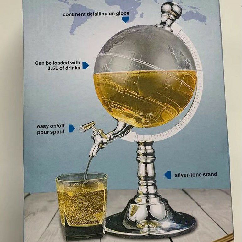 Le design imite un globe terrestre, avec un robinet pour le service.