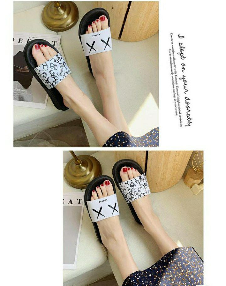 pantoufles Shopee populaires, sandales Kaws de style claquettes, disponibles en noir et blanc avec de différents motif "X.X" ou un motif camouflage/graphique.