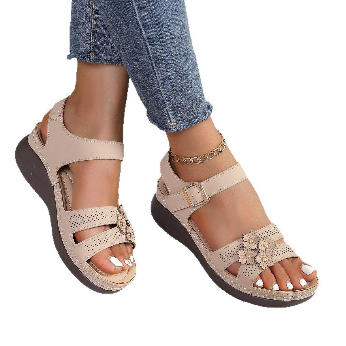 Sandales florales compensé transfrontalier grande taille un mot avec décoration florale sandales rétro pour femmes