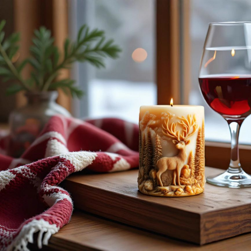 Moule en silicone pour fabriquer des bougies cylindriques sur le thème de Noël, représentant un cerf dans une forêt.