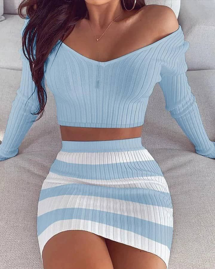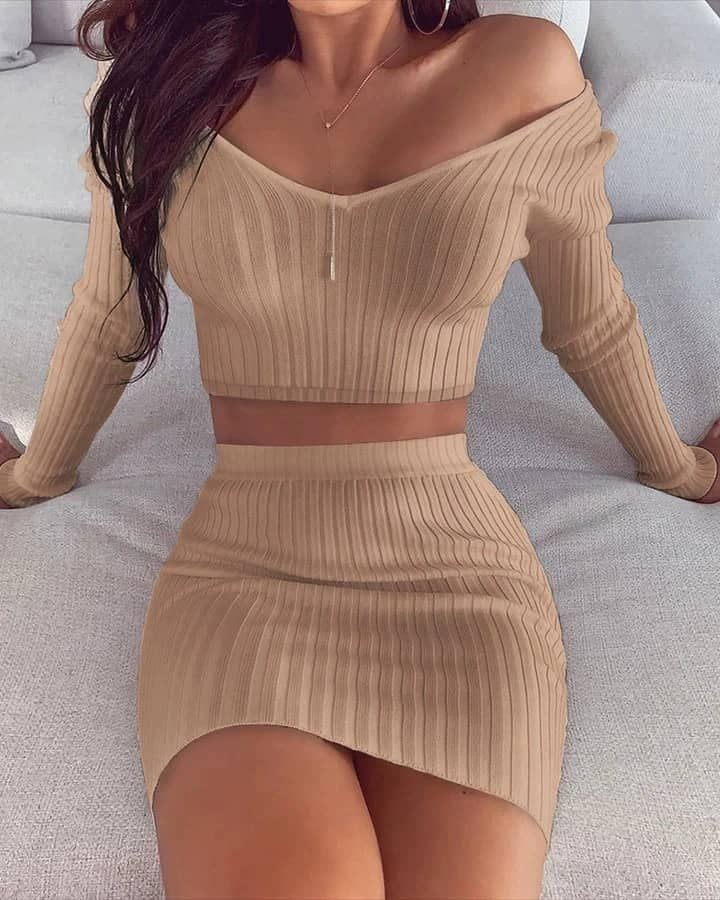 printemps 2021 et été sexy col en V inter colore haut en tricot à manches longues et jupe courte ensemble deux pièces