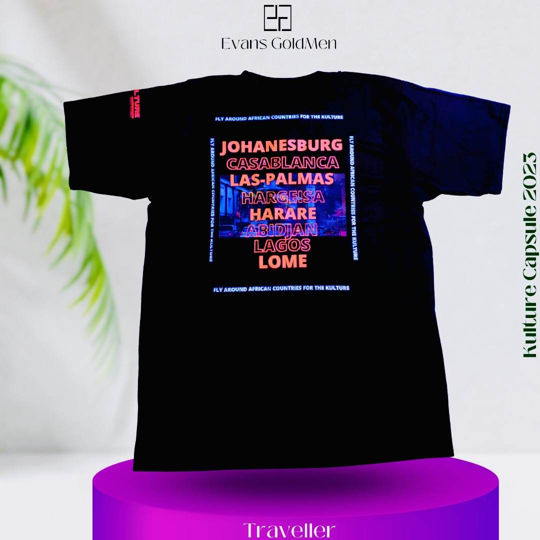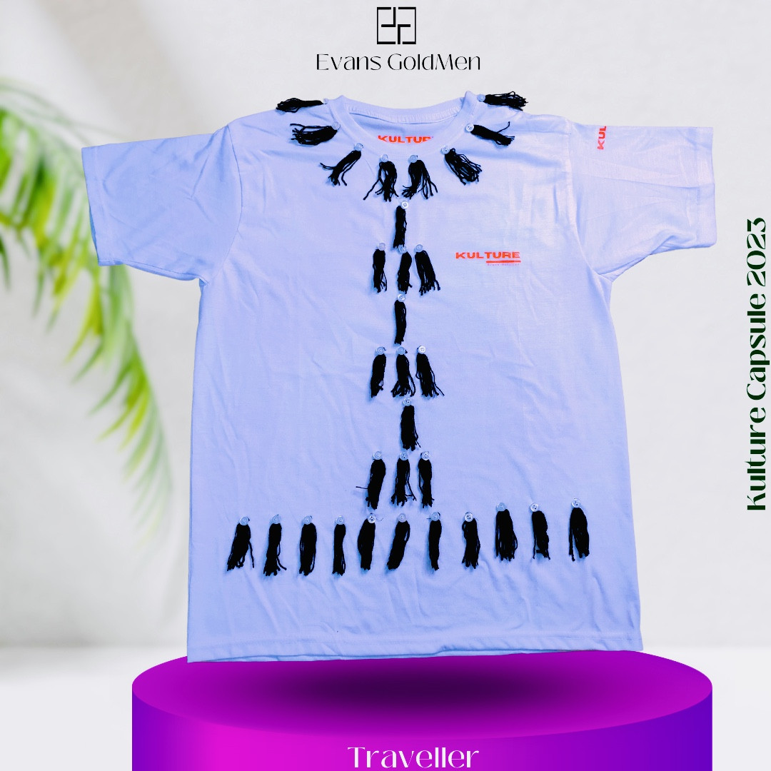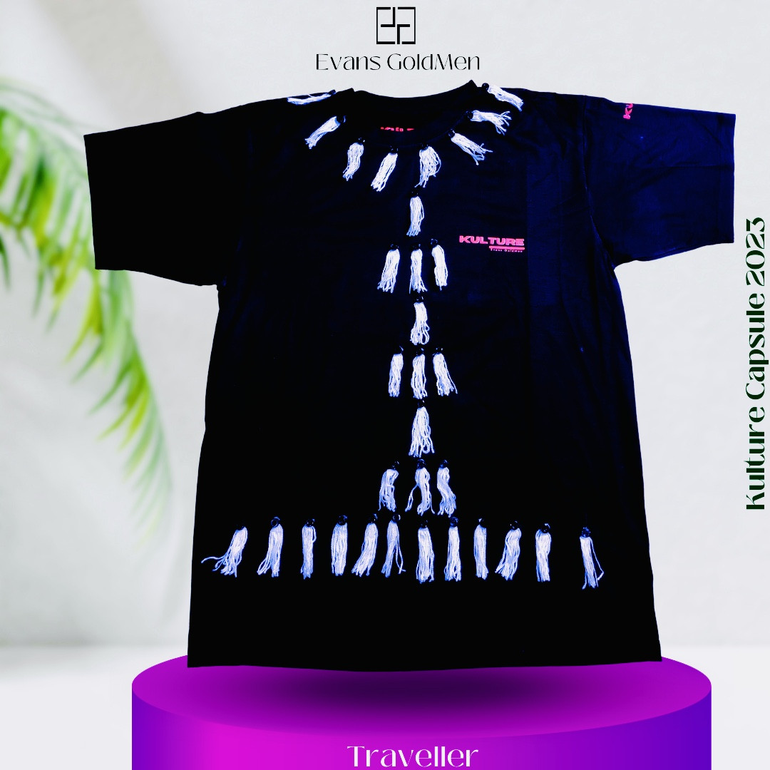 TRAVELLER est un imprimer de t-shirt issue de la collection «Kulture 2023 » de la marque Evans GoldMen. Fabriqué avec du cotton peigné du Bénin et embellit avec des fibres de laine donnant ainsi un côté artistique de ce dernier. Existant en deux coloris (noir et blanc)